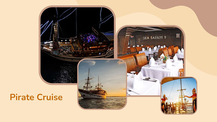 Spend your evening on the sea marveling the beautiful sunset while savoring our international buffet dinner sailing aboard our traditional Indonesian sailing Phinisi vessel with a pirate-themed atmosphere. Wear our complimentary Pirate accessories and play games with our pirate crews. Savor the fresh night breeze on the top deck as the night flows by while getting entertained by Live Music, Games with Door Prizes, traditional Balinese Dance, exotic Belly Dance, and breathtaking Fire Dance.